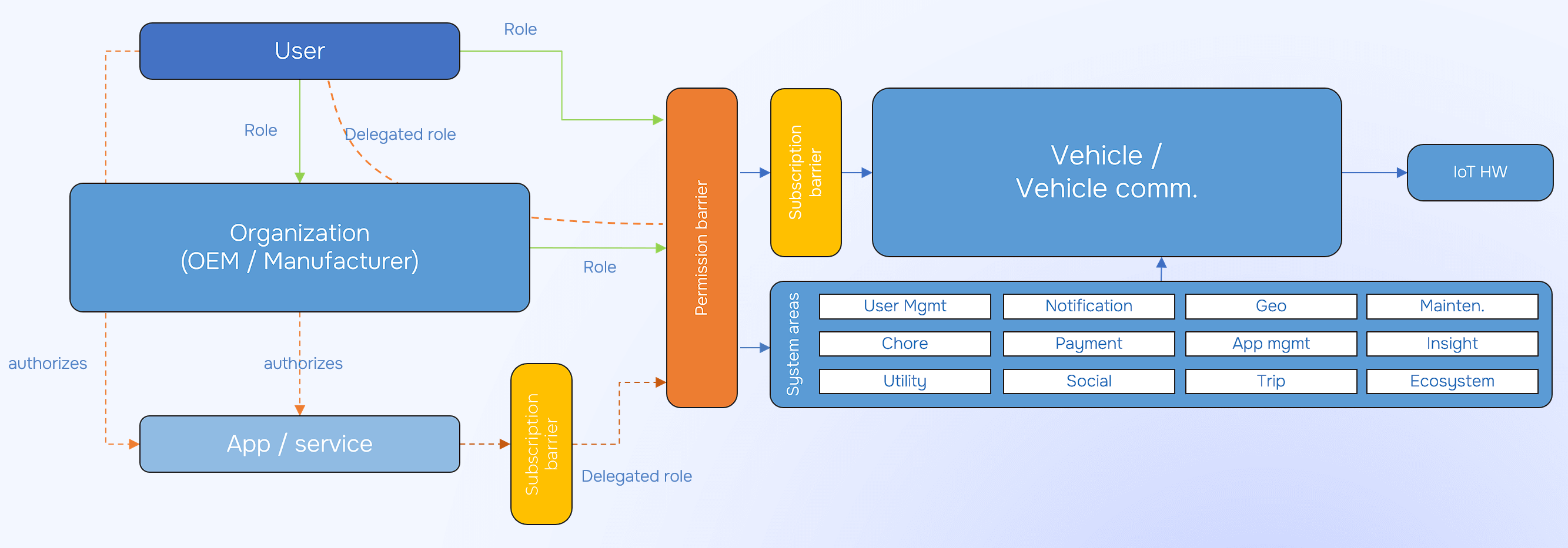 Generally, vehicle access is managed by two “barriers”:- Permission barrier: There are permissions for individual vehicles, as well as individual datapoints recorded by a vehicle. Permissions can be granted directly to users, or inherited via organizational membership.