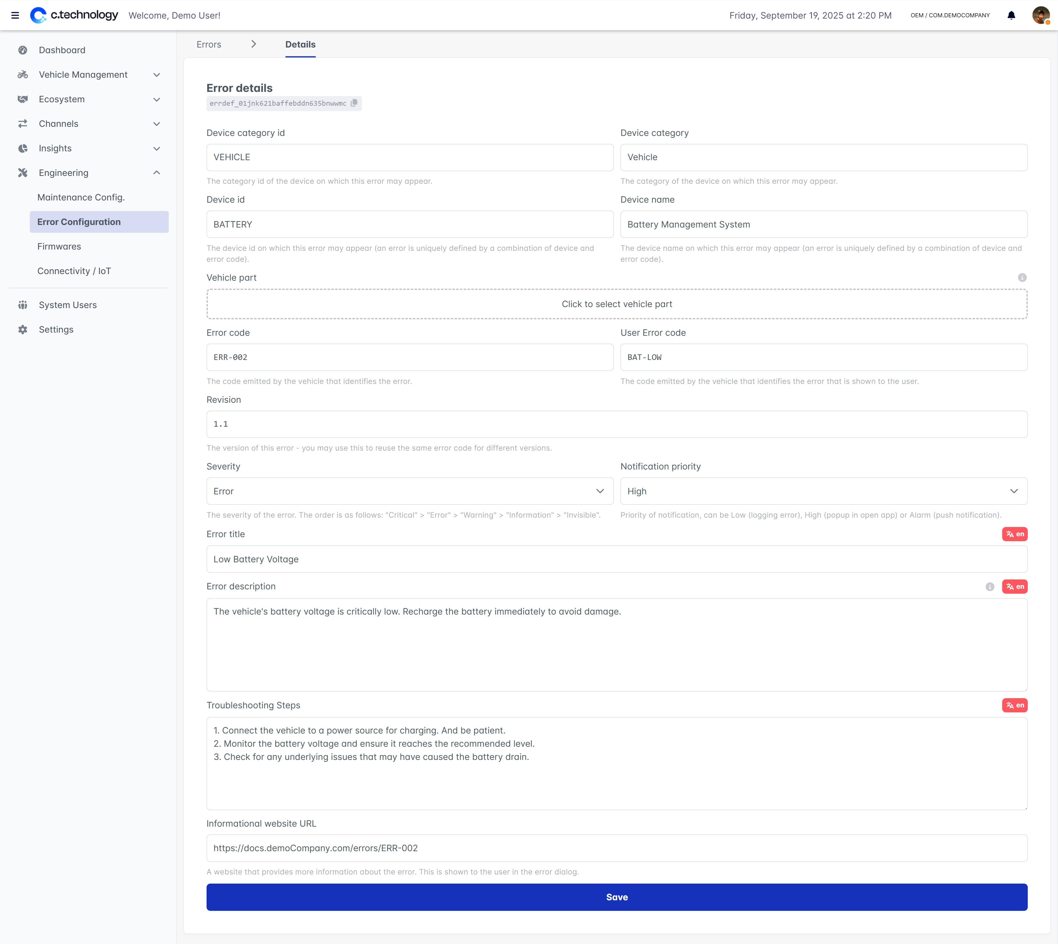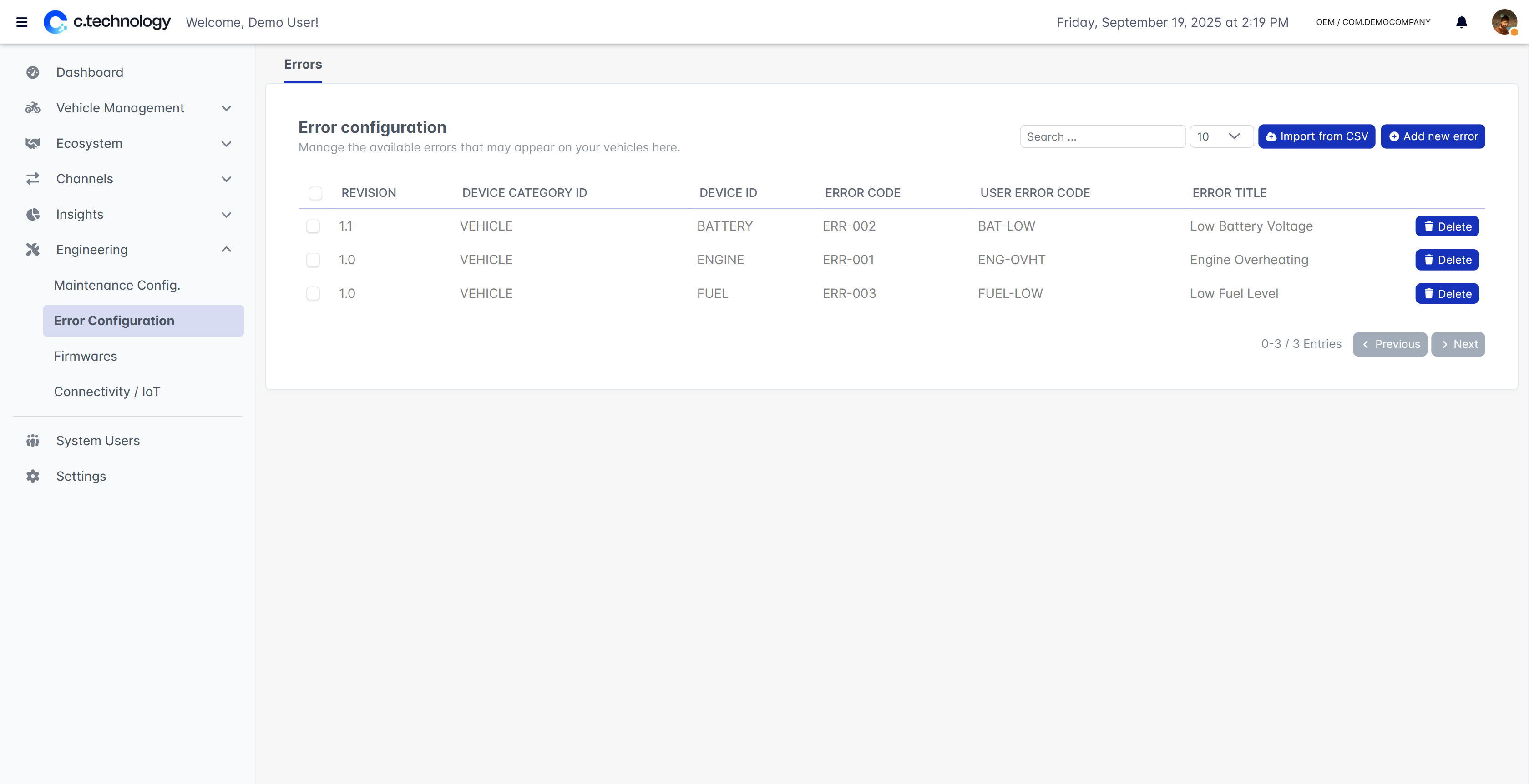 This section lets you manage error definitions that are used to interpret error codes received from vehicles. Error definitions include information about the error’s severity, description, and suggested actions. Irrespective of whether errors are received via IoT devices, Bluetooth connectivity, or API integrations, the c.technology system will try to resolve them using the definitions you provide here. You can add individual error definitions by clicking the “Add error definition” button, or import multiple definitions at once using the “Import from CSV” button.