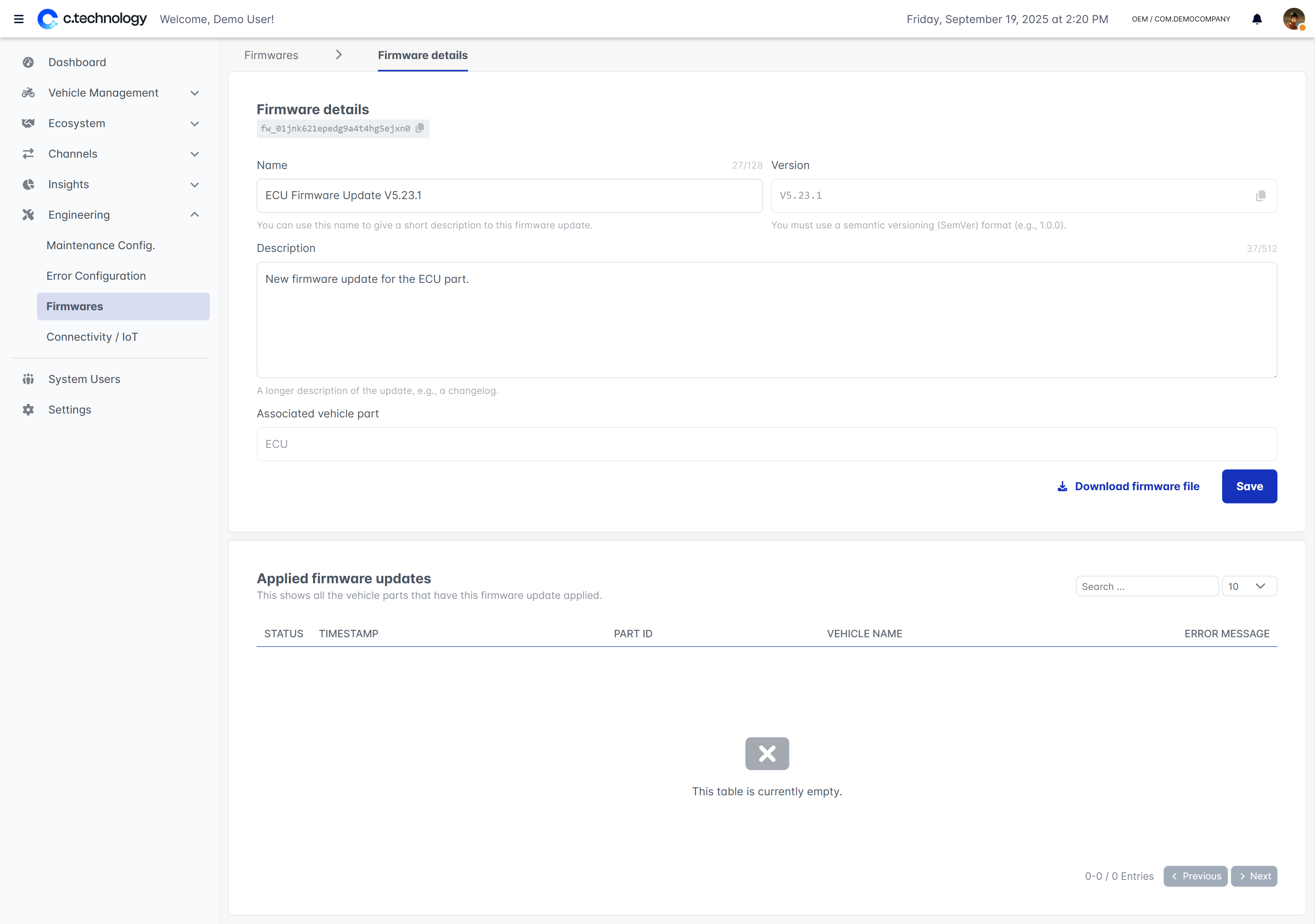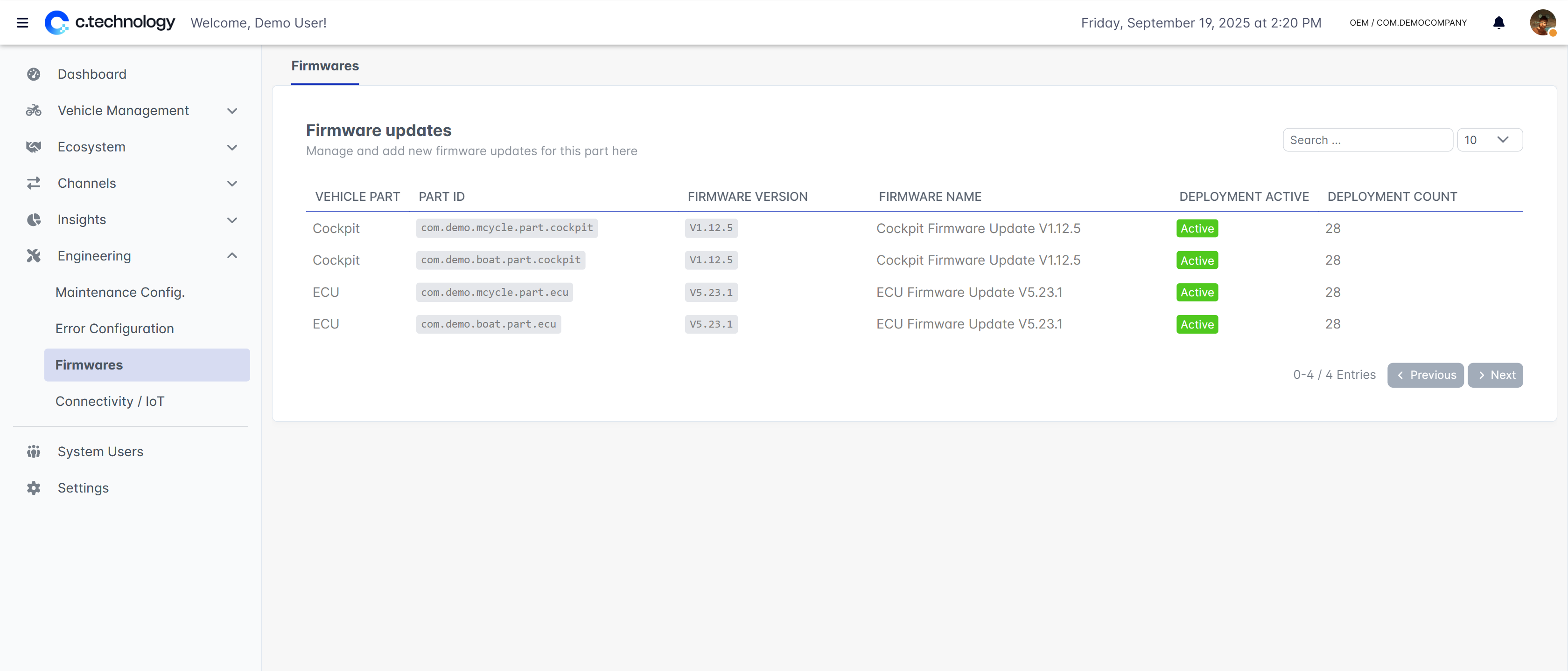 Firmware updates are a crucial part of modern vehicle maintenance, allowing you to deploy new features, improvements, and bug fixes remotely. The firmware management section provides an overview of all firmware versions that you have uploaded to the platform, along with their deployment status and download counts.The c.technology cloud platform allows managing firmware updates, but cannot install firmwares on your vehicles. You will need to implement the actual installation process in your IoT device.