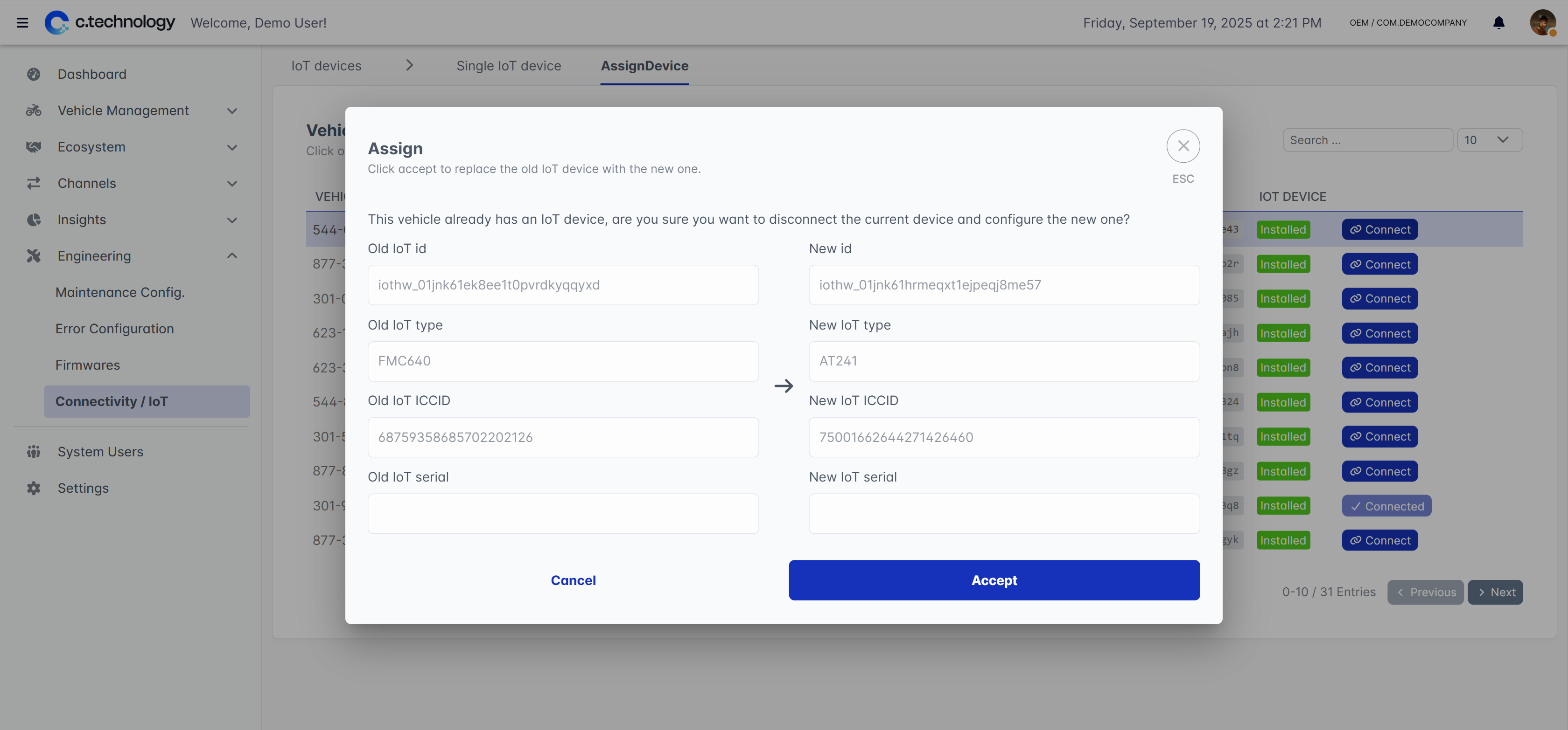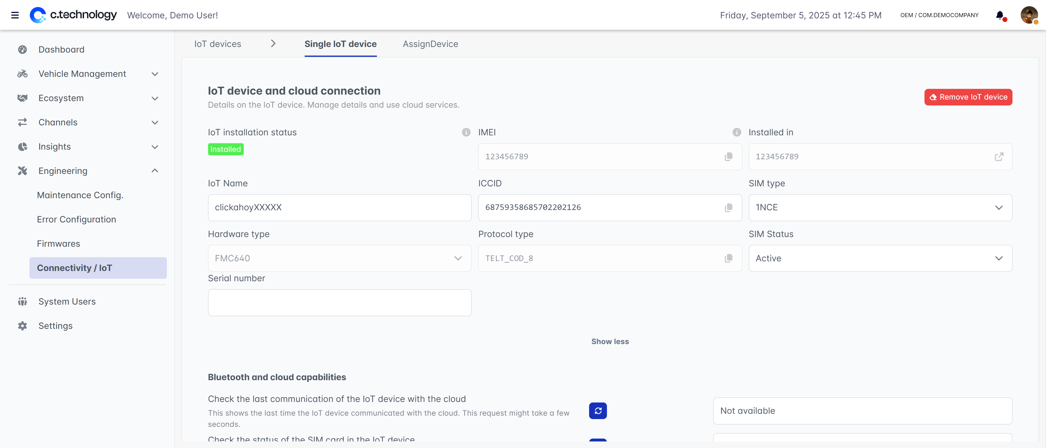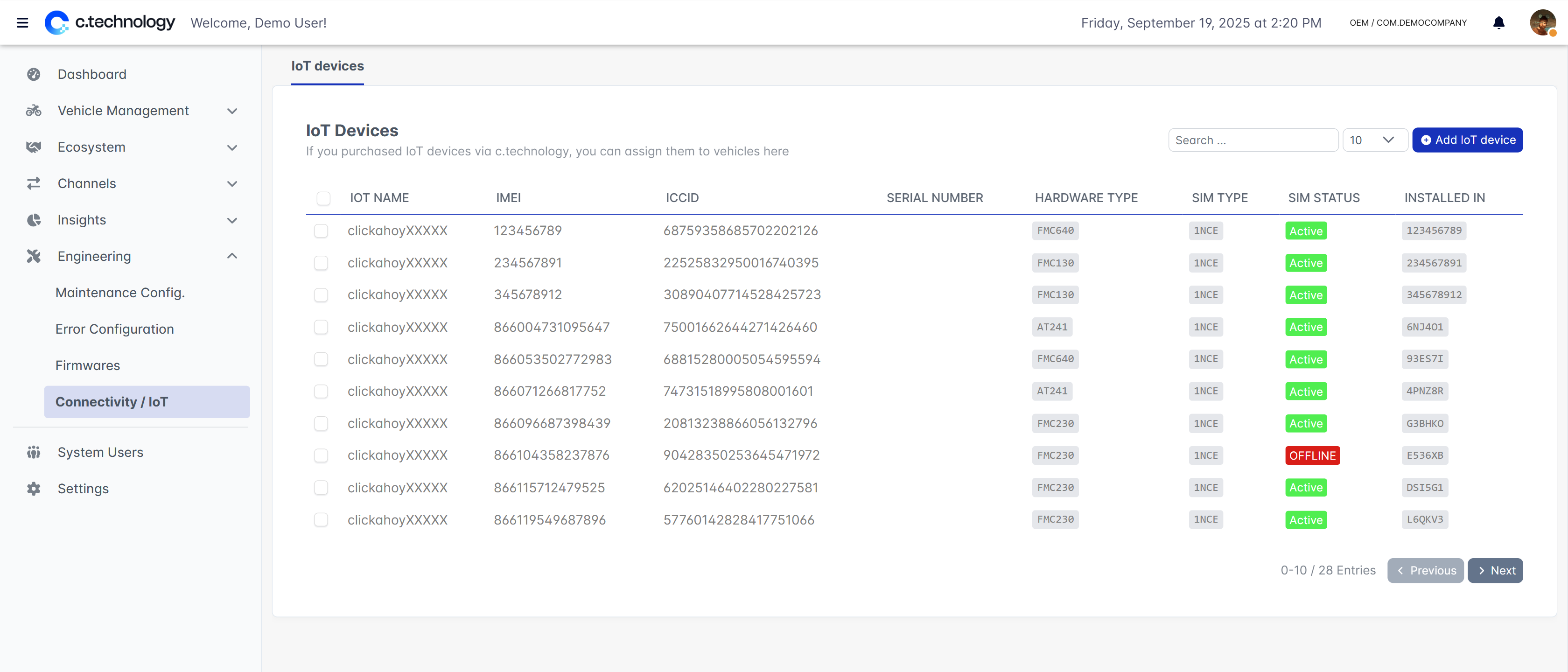 The IoT devices tab allows you to manage all IoT devices that are connected to your vehicles.This section primarily applies to you if you purchased IoT devices from us as part of our OEM solution. If you are using your own devices, you may not need to use this section.
