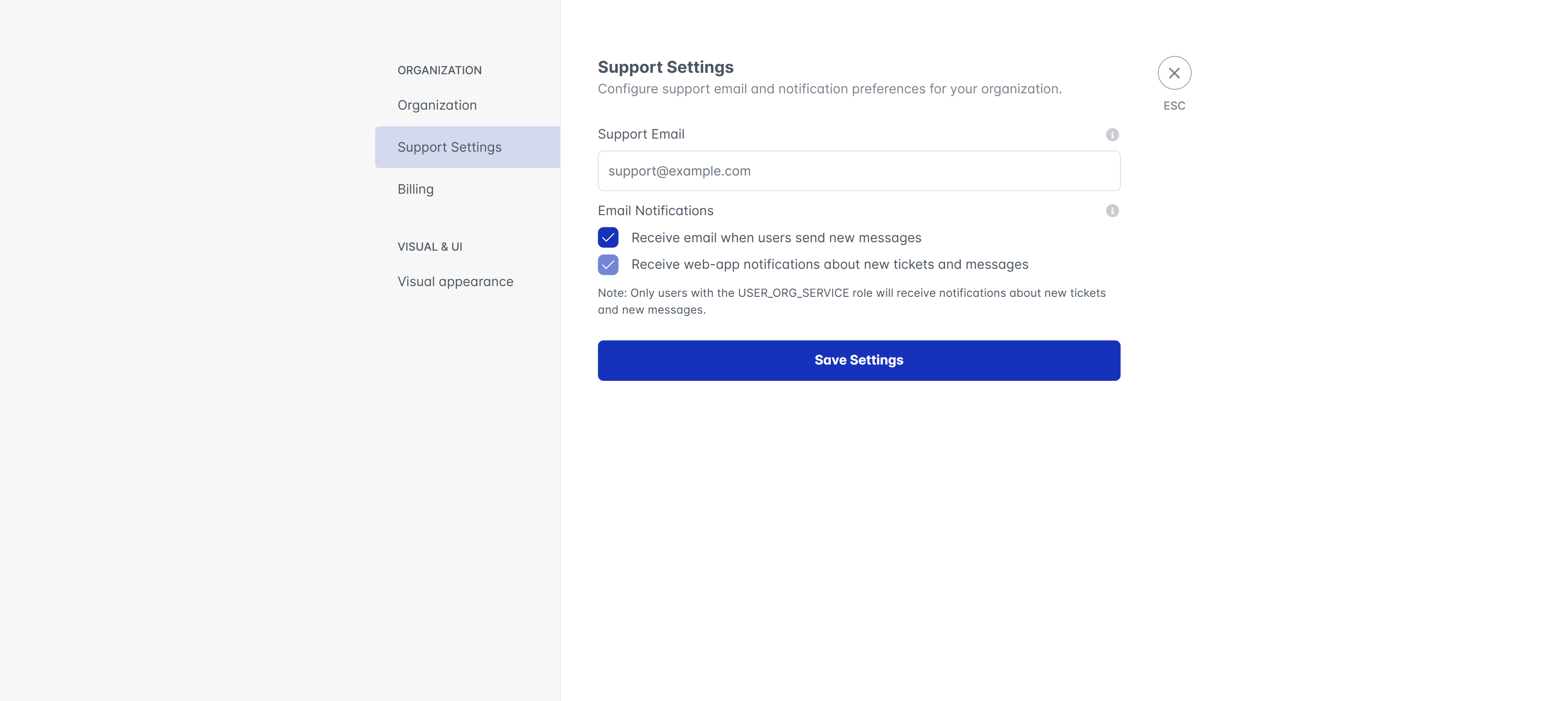 For support, you can specify a support email address and phone number that your customers can use to reach out to you for assistance. Additionally, you can specify if you should be sent emails upon new support messages from your customers.