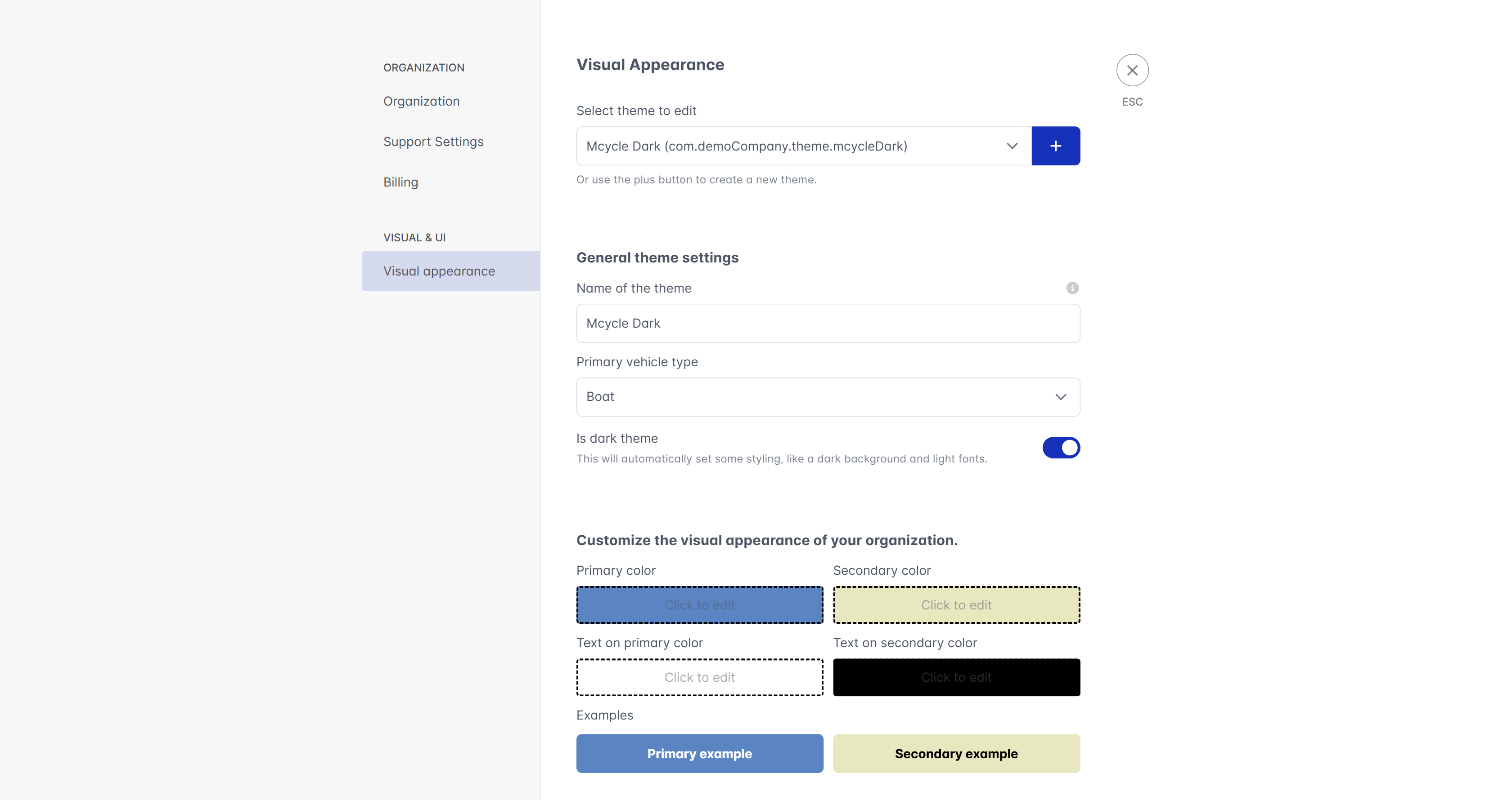 The visual settings allow you to customize the appearance of the OEM Suite, Professional Hub and Private Webapp for your organization. It allows uploading various logos and images that will be shown to your customers in different places. You can also customize the primary color used in the apps to match your corporate design.
