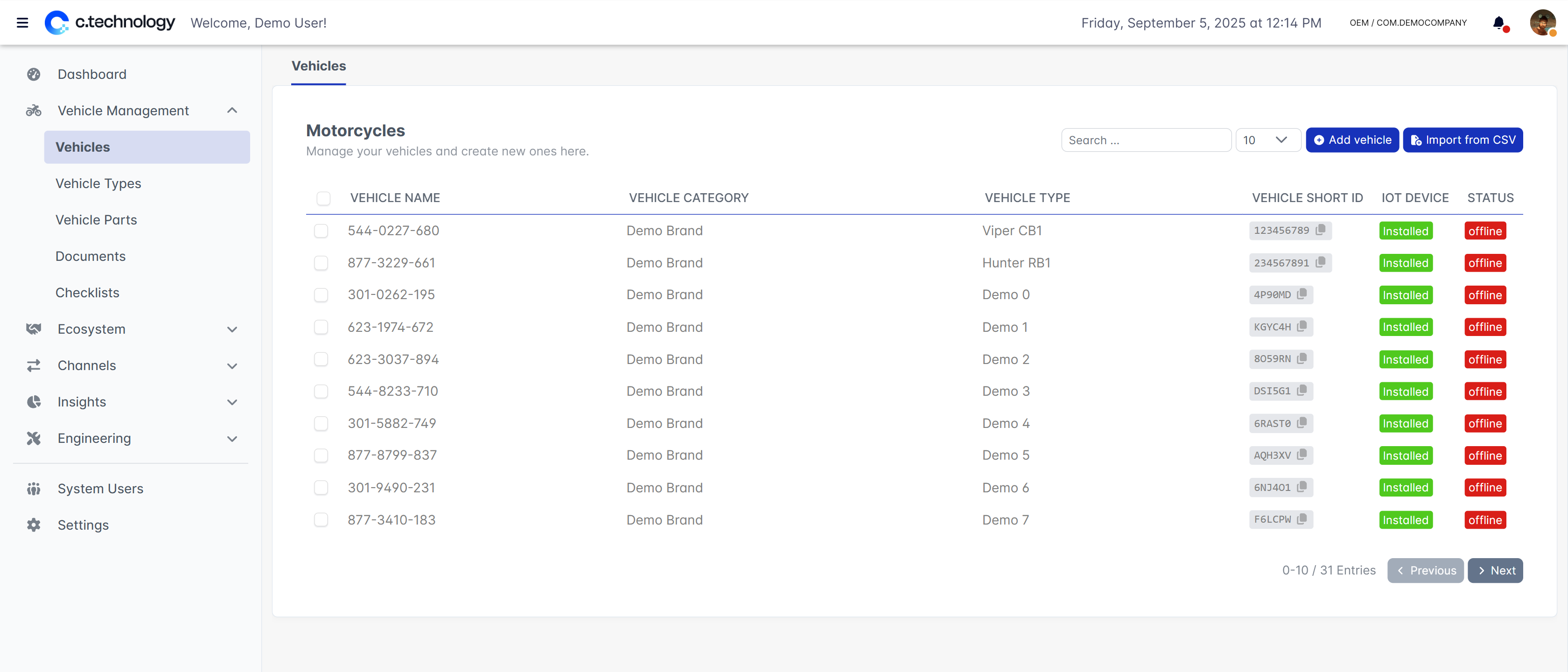 - Import from CSV: Bulk import multiple vehicles. You can either add IoT devices during import or link them later.