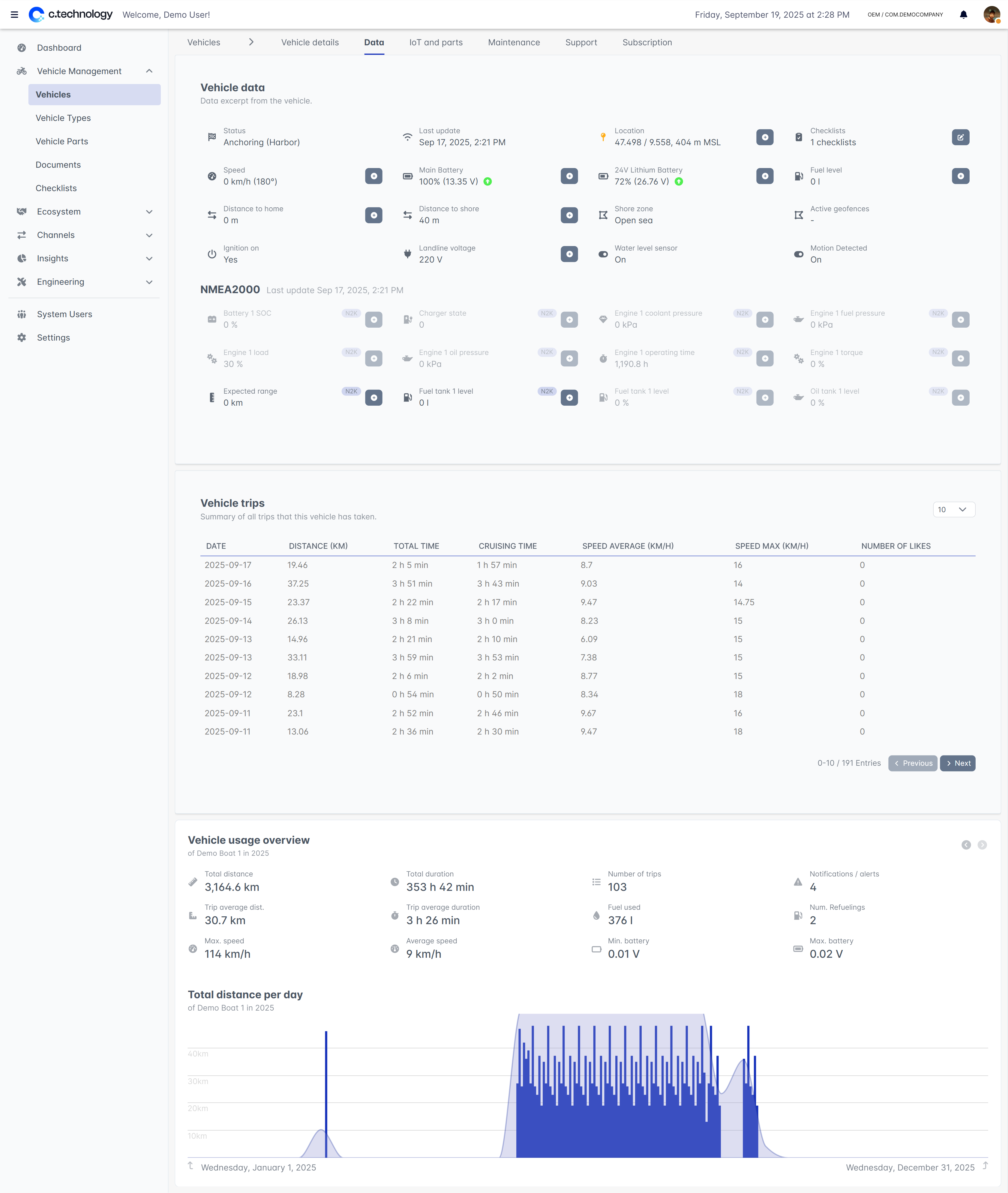 The data tab provides detailed insights into the vehicle’s data and status.All data access will always be in accordance with organizational or personal access rights. For example, except if your organization is a