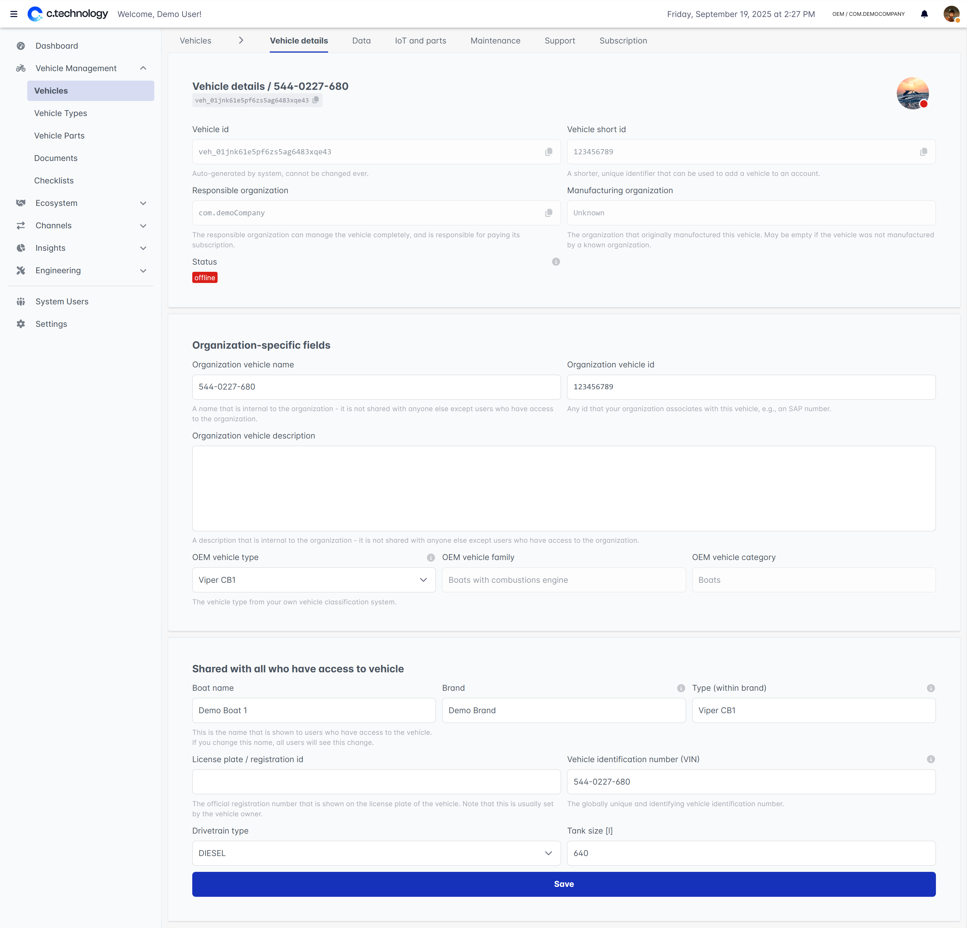On this tab, you can manage basic vehicle information and organizational assignment.