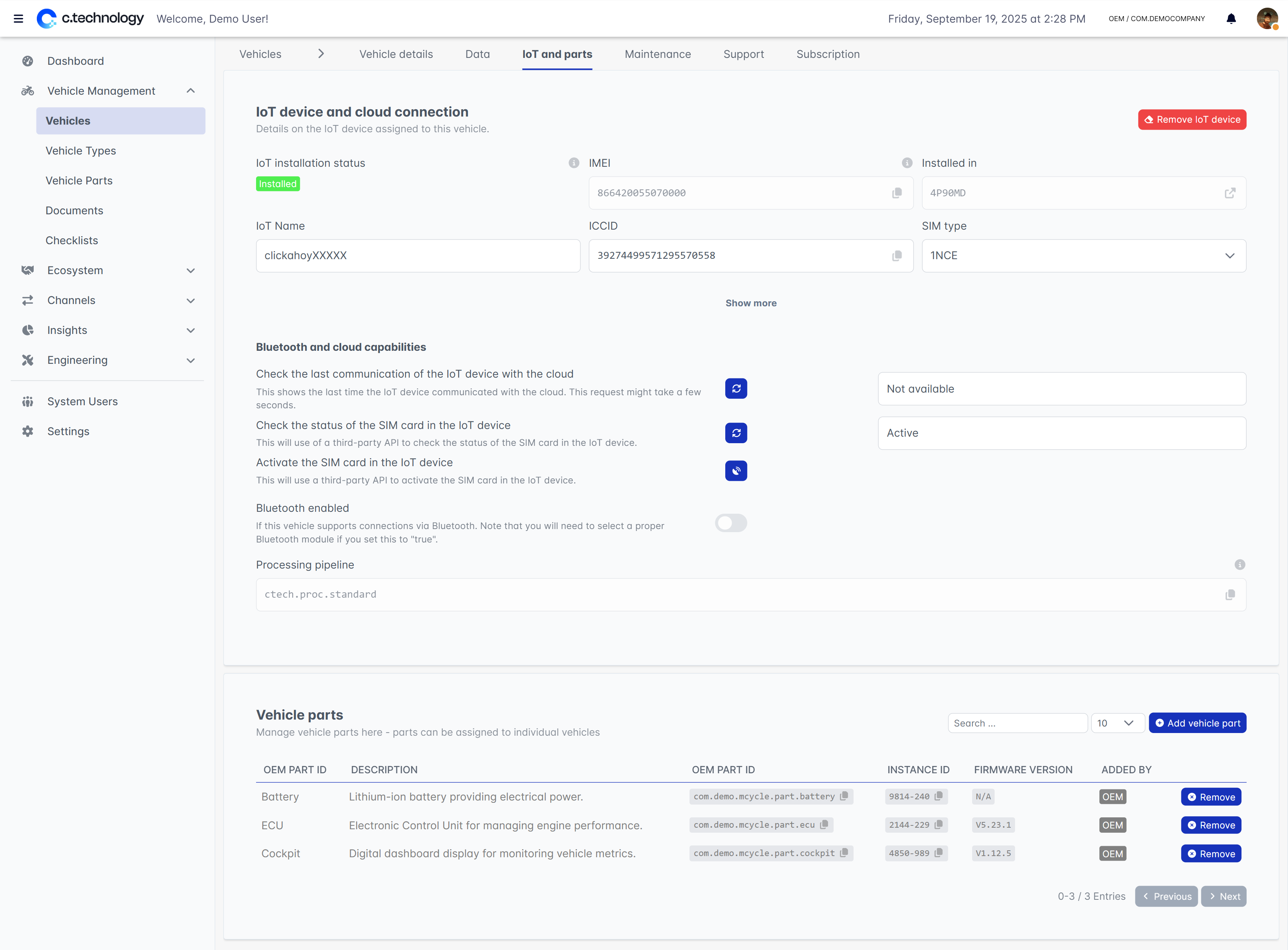 This tab allows you to manage IoT devices / Bluetooth connectivity and track installed vehicle parts. An IoT device is optional if a) you solely upload data via APIs or b) the vehicle is solely accessed via Bluetooth. If an IoT device is connected, you can see its status and details on the top. If no device is connected, you can add one by clicking the “Add IoT device” button. You can also remove an existing device if needed, for example, if you replace it or move it to another vehicle.