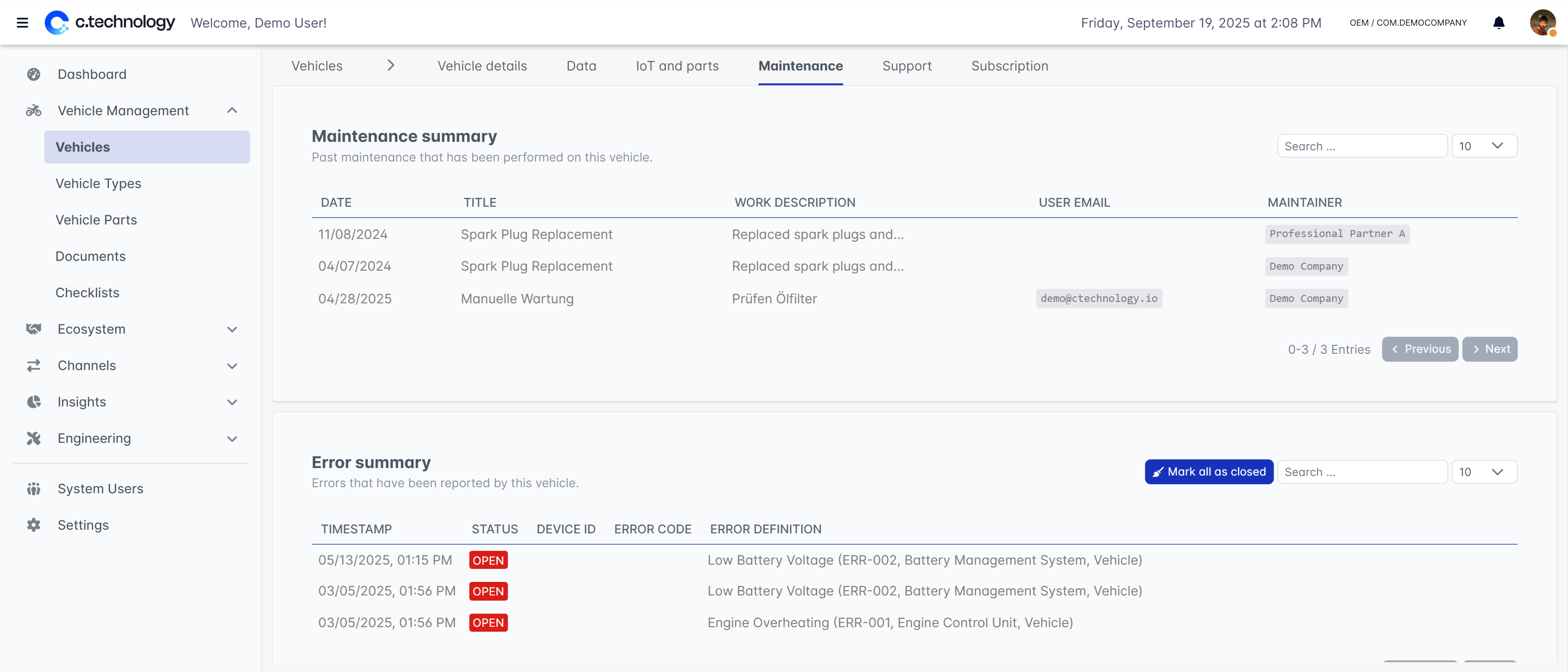 The maintenance tab provides a summary of all past maintenance that has been performed on the vehicle. Additionally, all (DTC or other) errors that have been detected on the vehicle are shown.