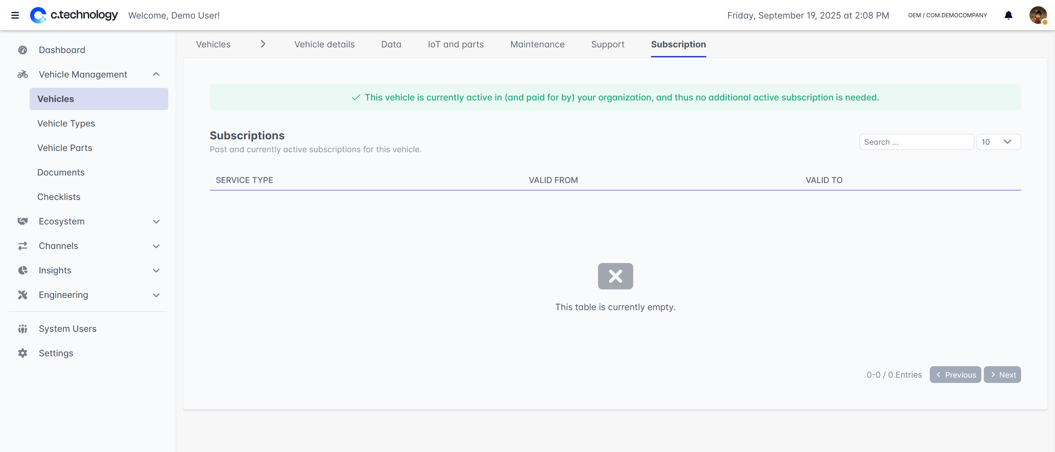 The subscriptions tab provides an overview of all active and past service subscriptions associated with the vehicle.For most of your vehicles, you will not have to manage individual subscriptions, as they are handled globally on an organization level.