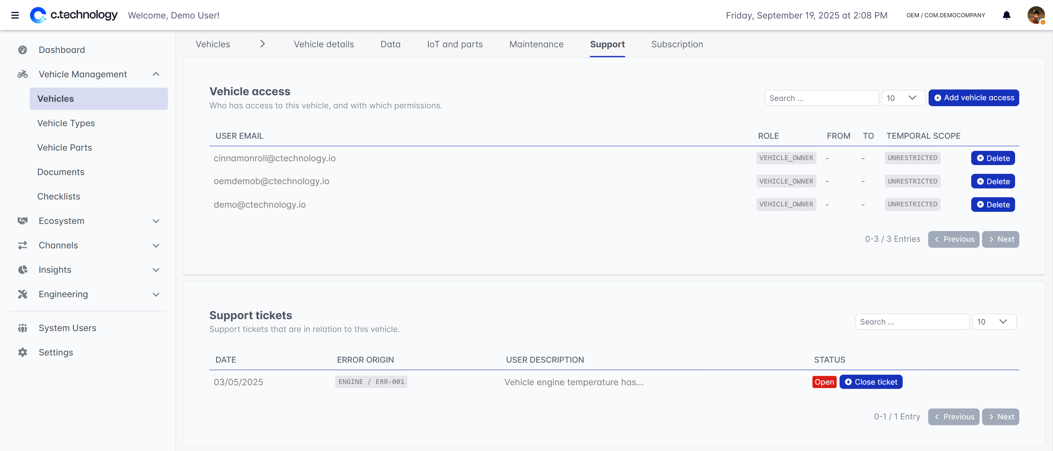 In the support tab, you can manage access control and support tickets for the vehicle. As an OEM, you have the possibility to change user access for level 3 support.Note that all changes to user and organizational accesses are logged and auditable.