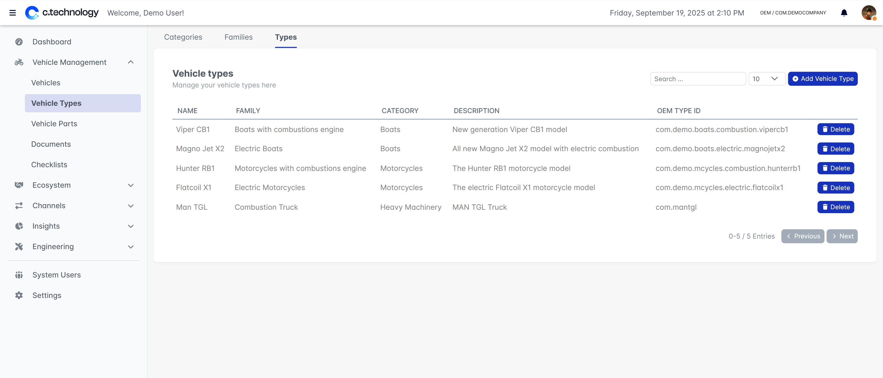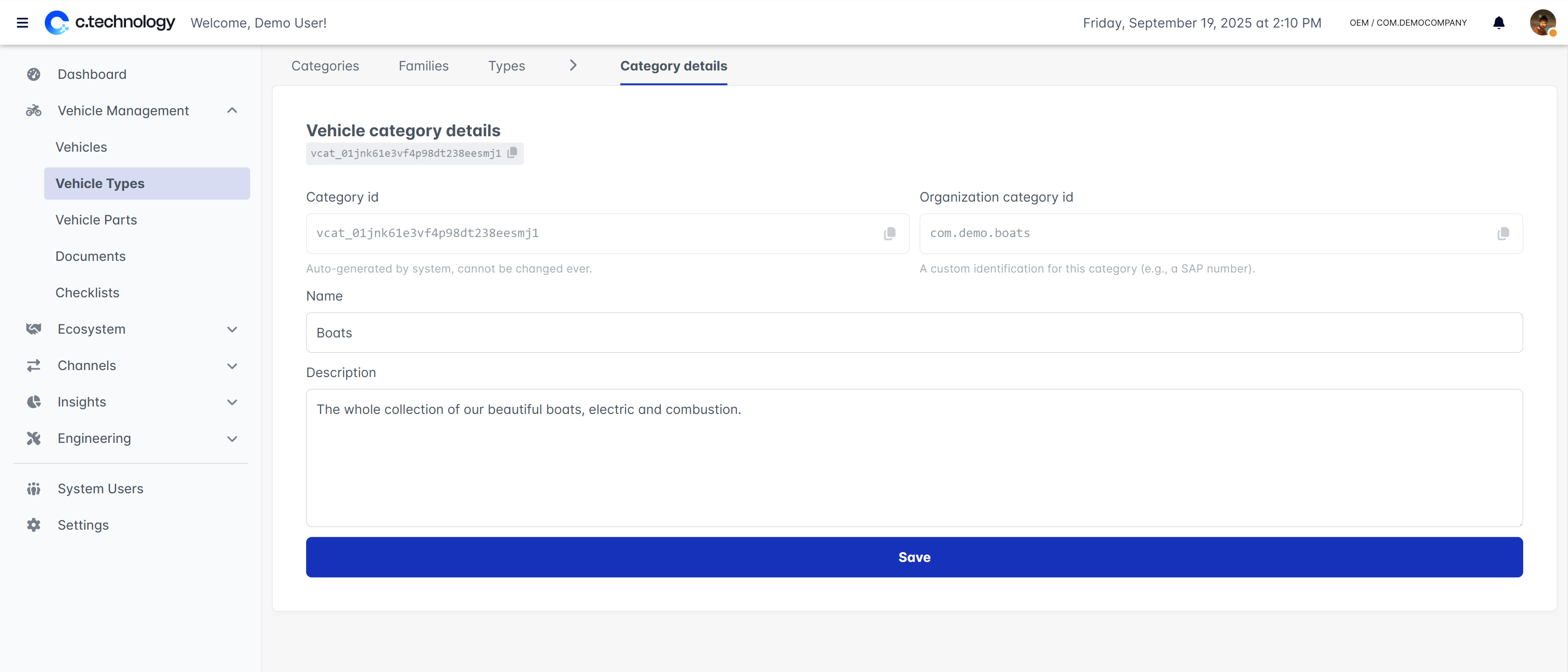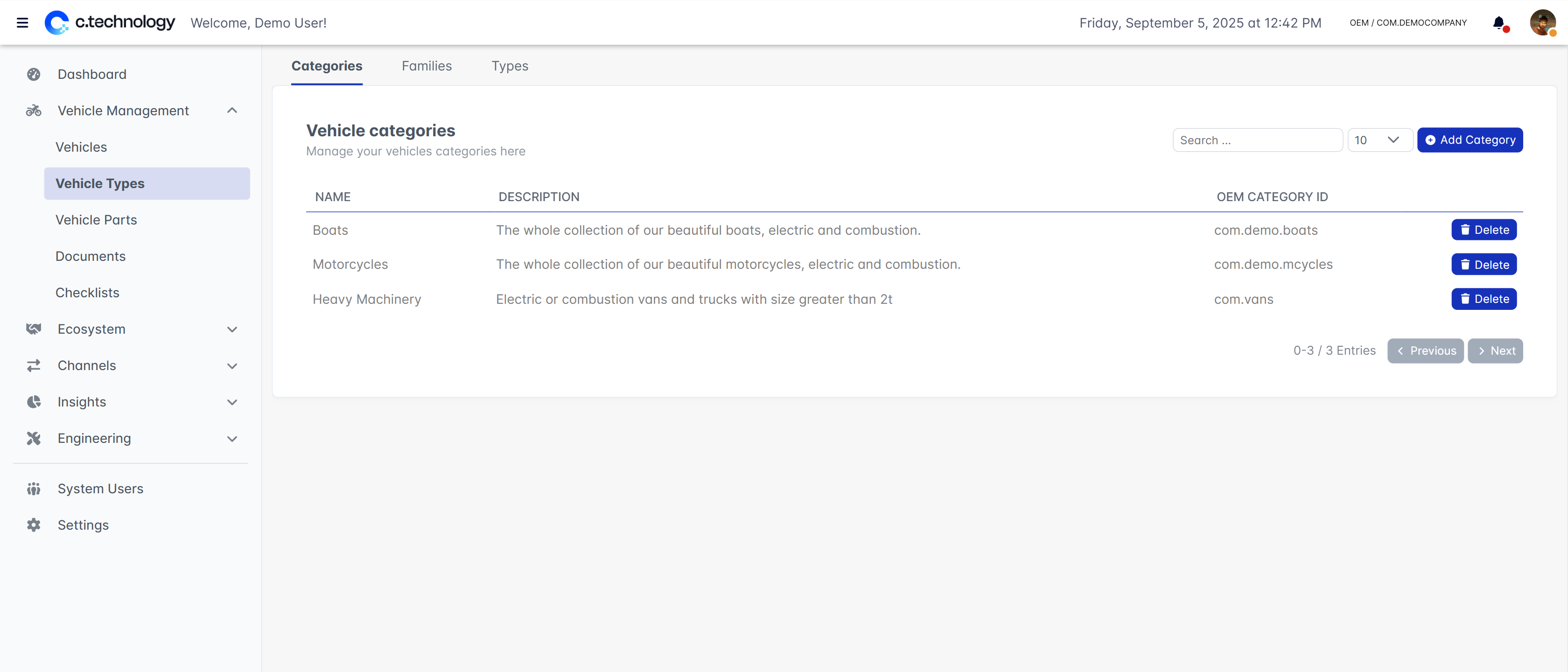 The platform uses a three-level hierarchy: Categories → Families → Types. Each vehicle can be assigned one type per organization, which automatically links it to the corresponding family and category. Parts are orthogonal, and can be associated with individual vehicles.- Categories: High-level groupings (e.g., “Adventure,” “Cruiser,” “Marine”)