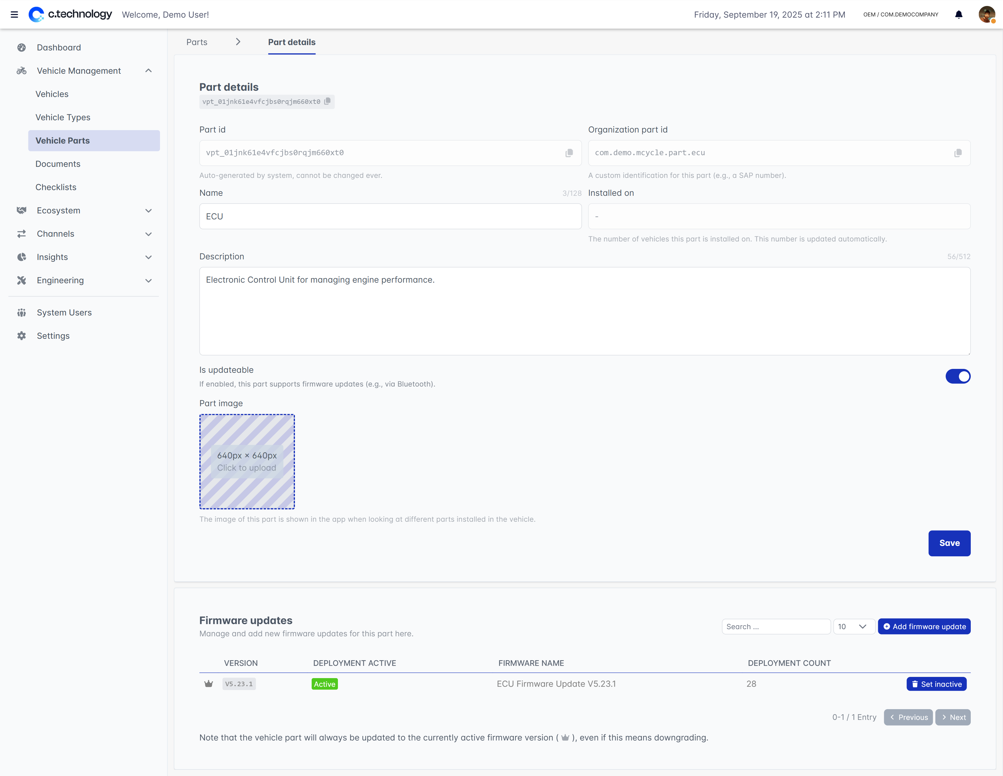 By defining “development” parts and assigning them to test vehicles, you can test firmware updates before rolling them out to production vehicles.