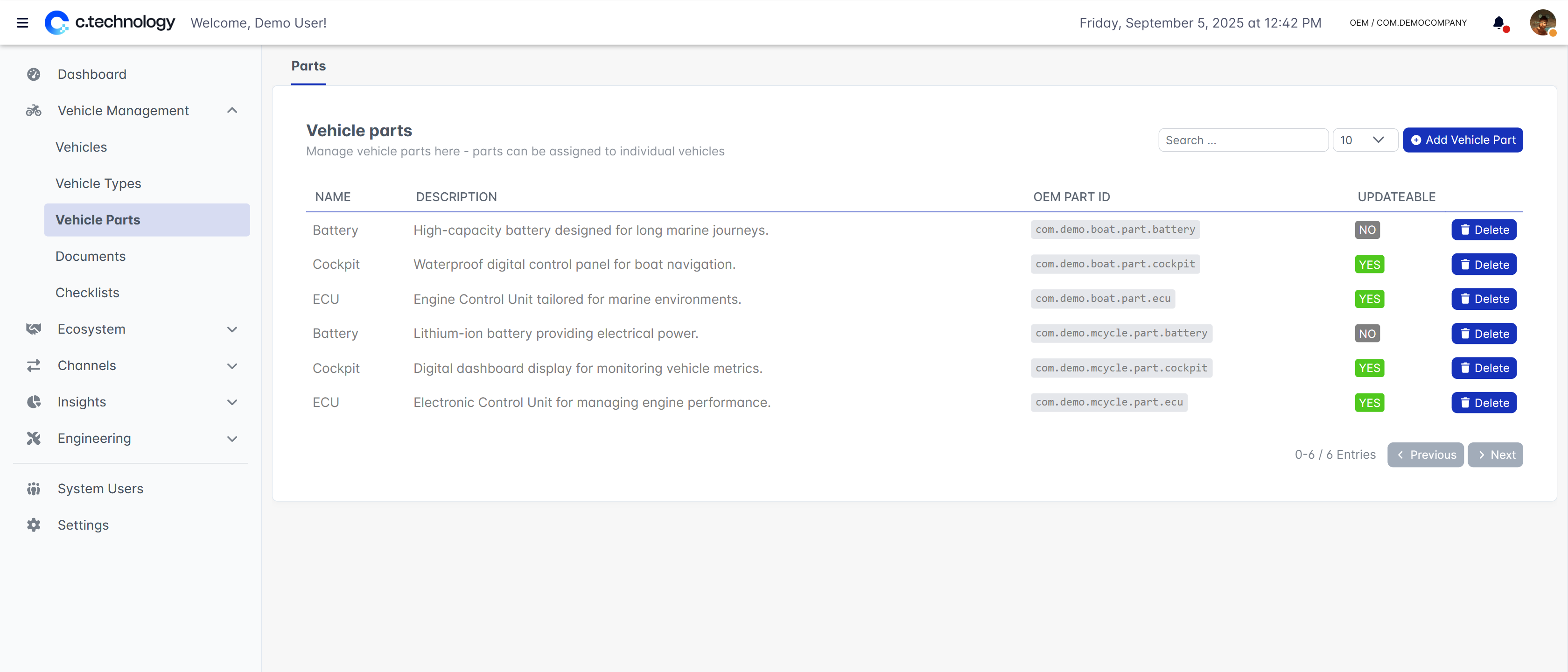 Vehicle parts can be assigned to vehicles to represent installed components, hardware, or accessories. They are independent of the vehicle taxonomy and can be used to track both factory-installed and aftermarket parts. Vehicle parts are particularly useful for:- Managing component inventories